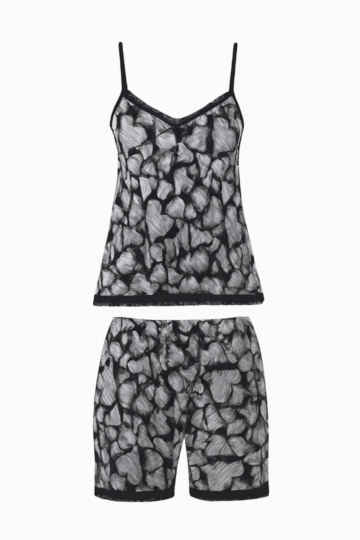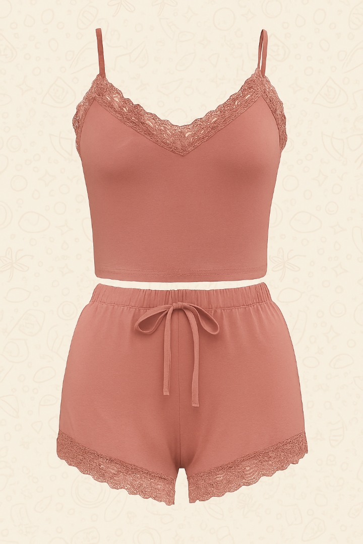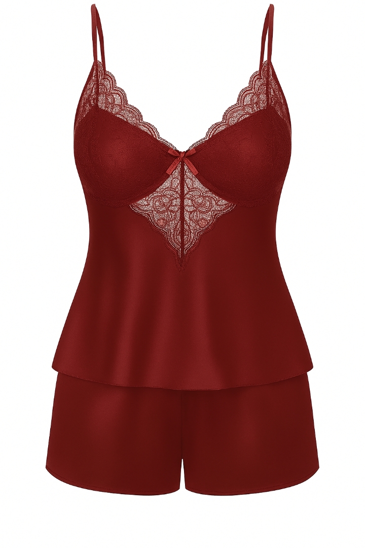 لباس خواب ساتن تاپ و شلوارک ساتن گیپور دار ema